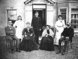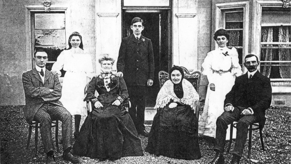 It is a family photo of the Henderson family sitting outside their farm in Bangor, County Down.
